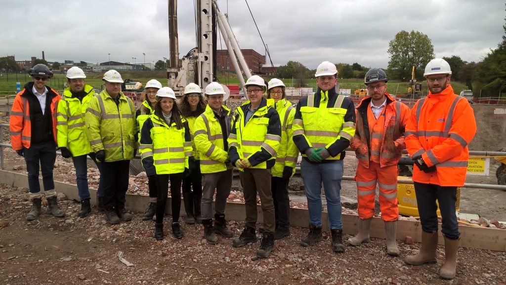 Green Earth skilled construction workers stands together at an active job site, all wearing high-visibility vests, hard hats, and work boots. Some are holding tools like hammers and spirit levels, while others stand casually with arms crossed. Behind them, the framework of a new building rises, scaffolding and construction materials neatly arranged. The team is smiling, showing camaraderie and pride in their work, This ensures our staff benefit from high quality training to equip them with the skills and confidence to prepare them for their role.